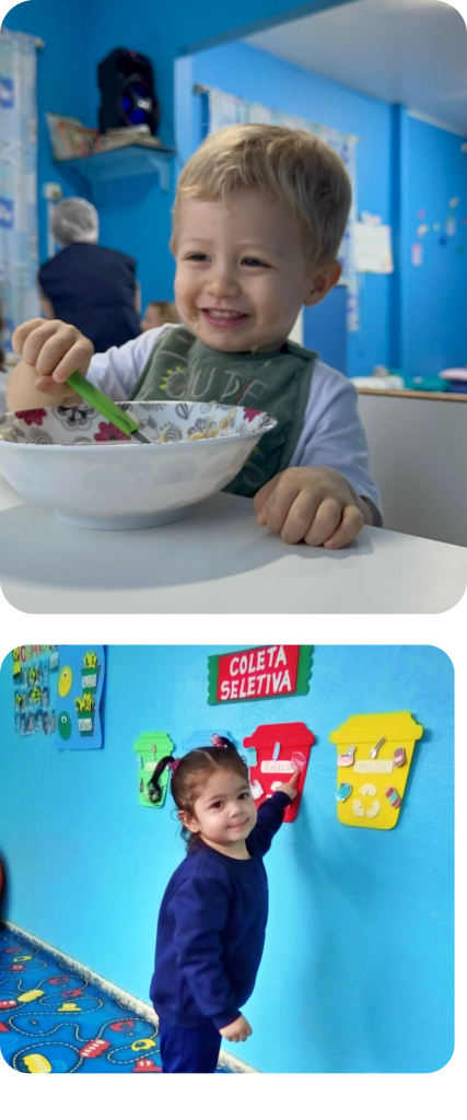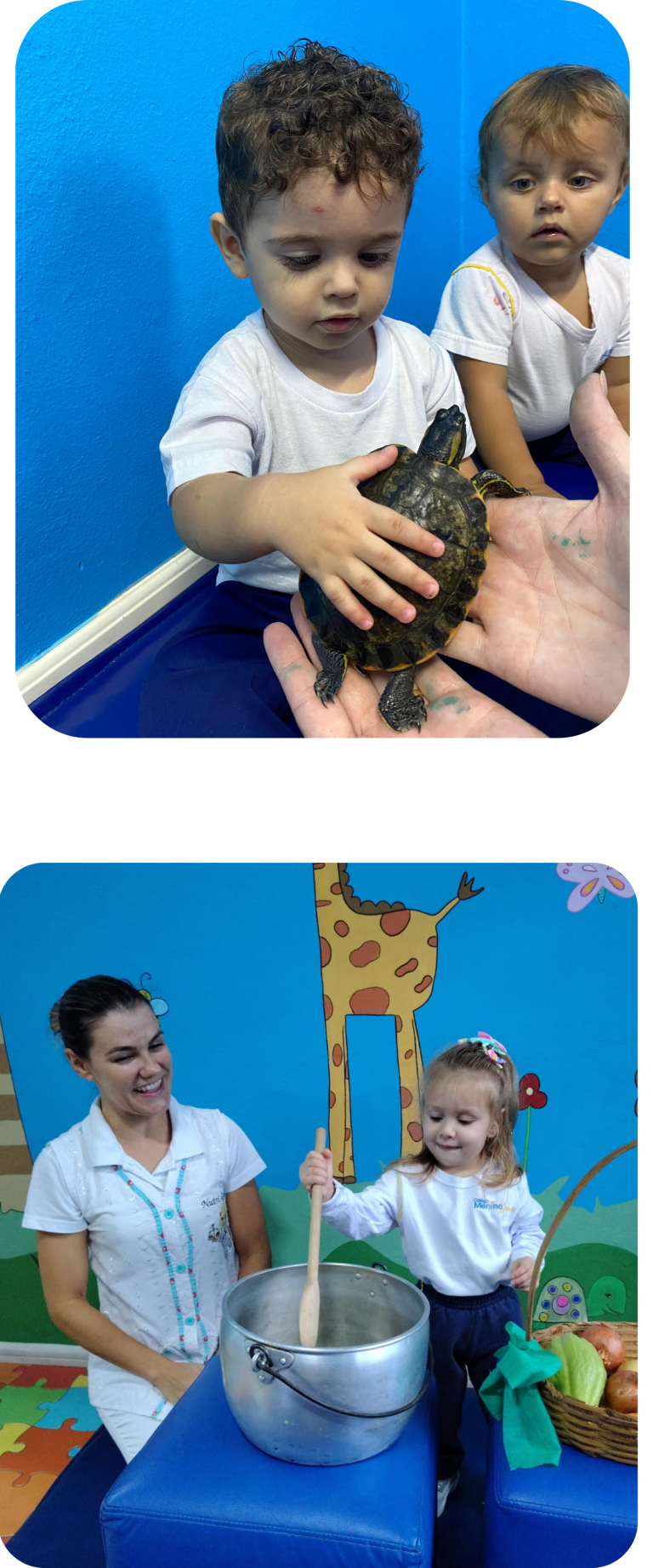 Referência curricular pautada em movimento, expressão artística, natureza, sociedade, linguagem oral e escrita, identidade e autonomia, nutrição, desenvolvimento musical e matemática de uma forma contextualizada com o tema dos projetos e temas desenvolvidos em sala de aula.